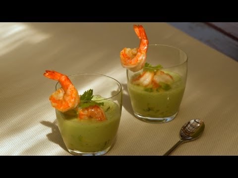 Video recept - Avokádo-jogurtová polévka s krevetami.